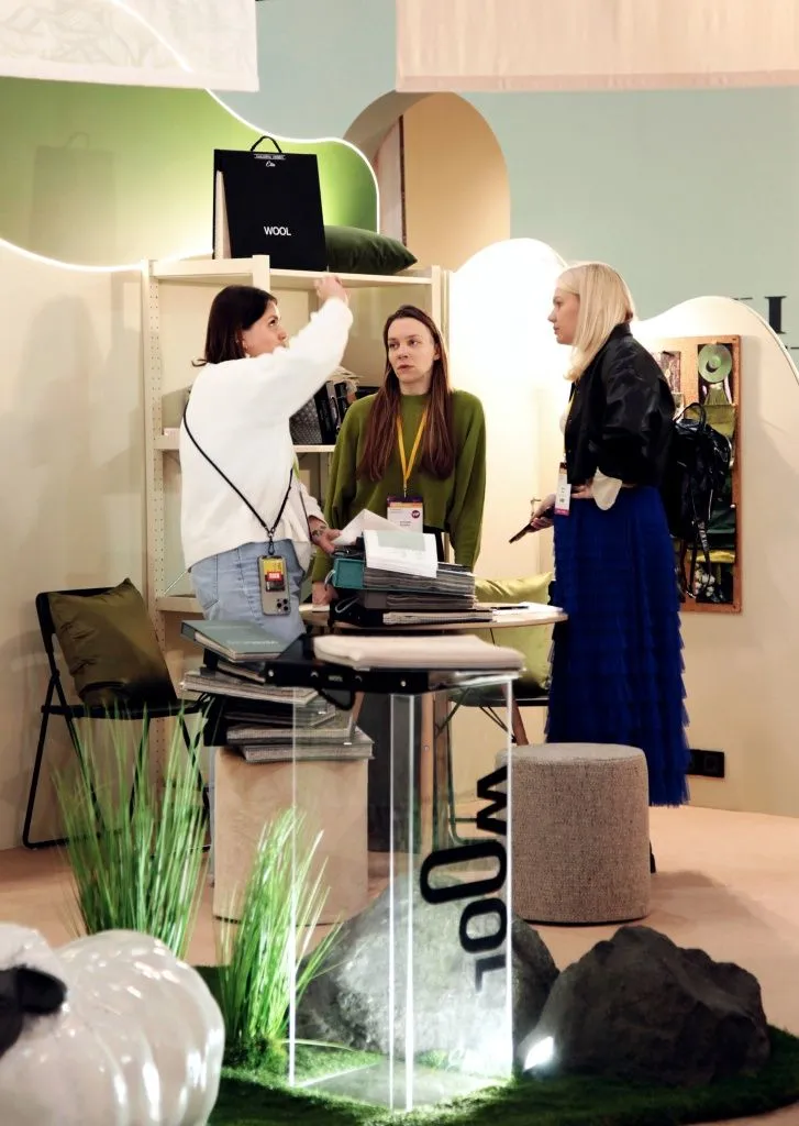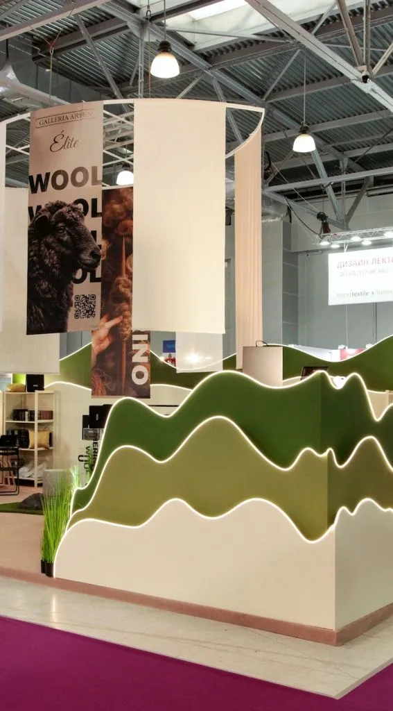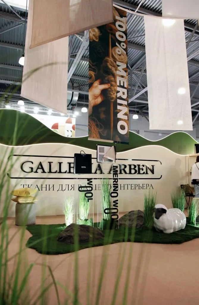 Мы посвятили стенд нашей новой коллекции тканей из натуральной шерсти мериноса - Wool. Мягкие овцы, солнечные холмы, трава и камни - мы постарались создать атмосферу австралийских горных регионов на фоне которых, натуральная шерсть смотрится наиболее органично и естественно.